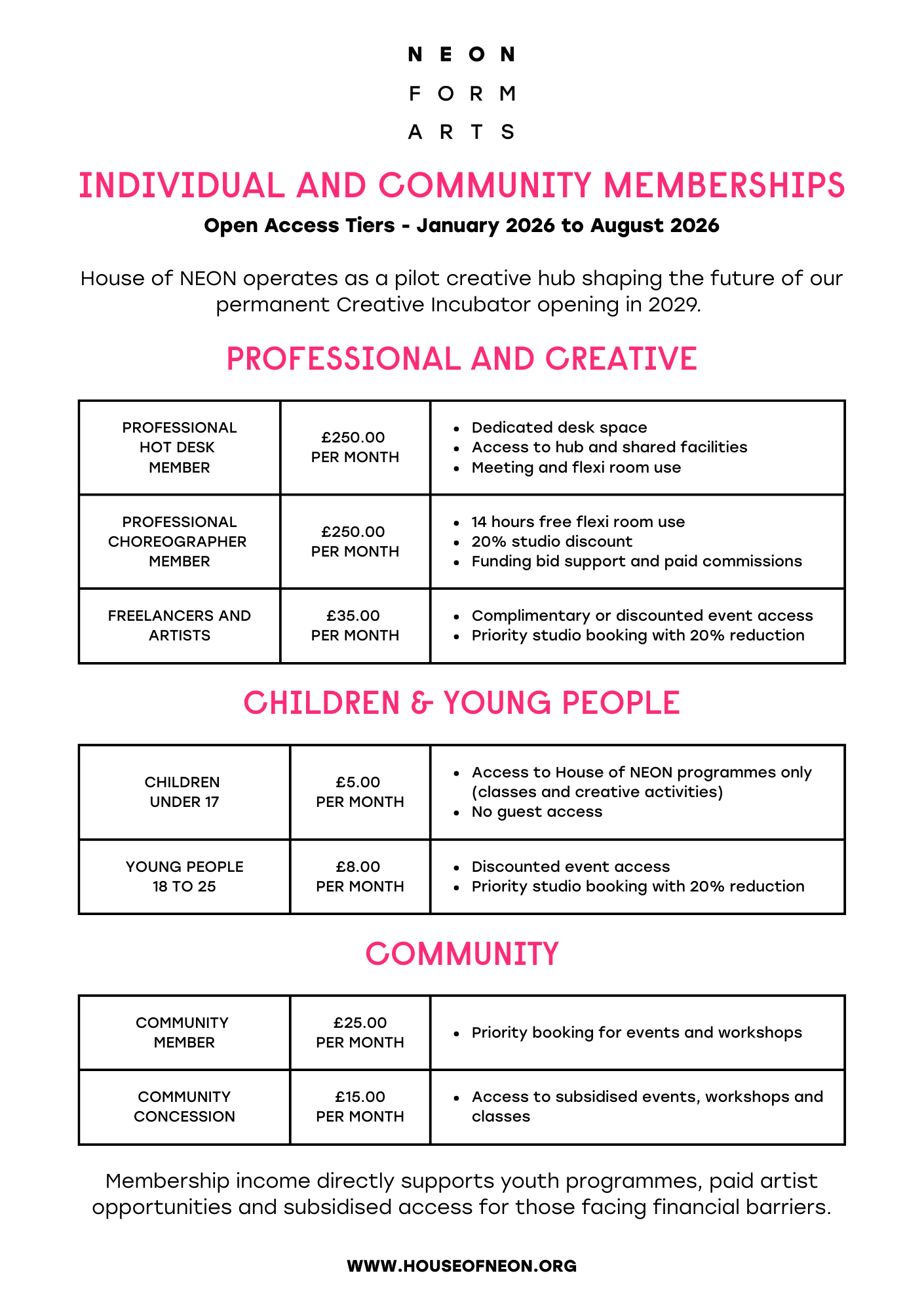 House of NEON operates as a pilot creative hub shaping the future of our permanent Creative Incubator opening in 2029. Membership income directly supports youth programmes, paid artist opportunities, and subsidised access for those facing financial barriers.