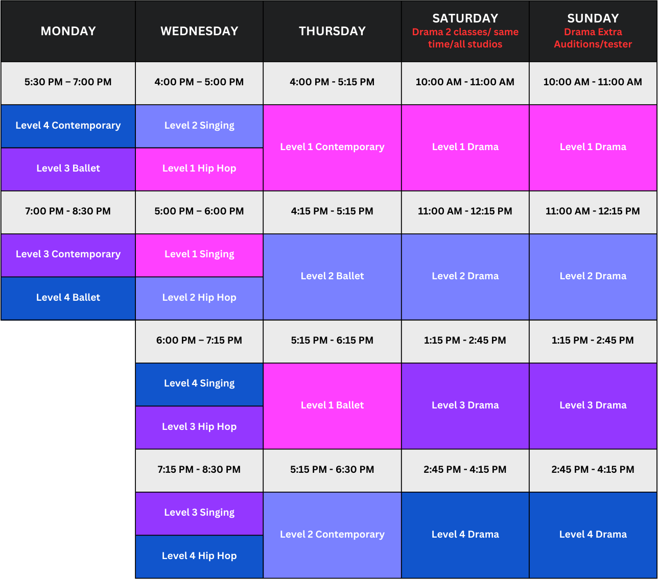 Neon Performing Arts offers Dance classes in Ballet, Modern Jazz, and Hip-Hop, which are held throughout the week in the evenings.